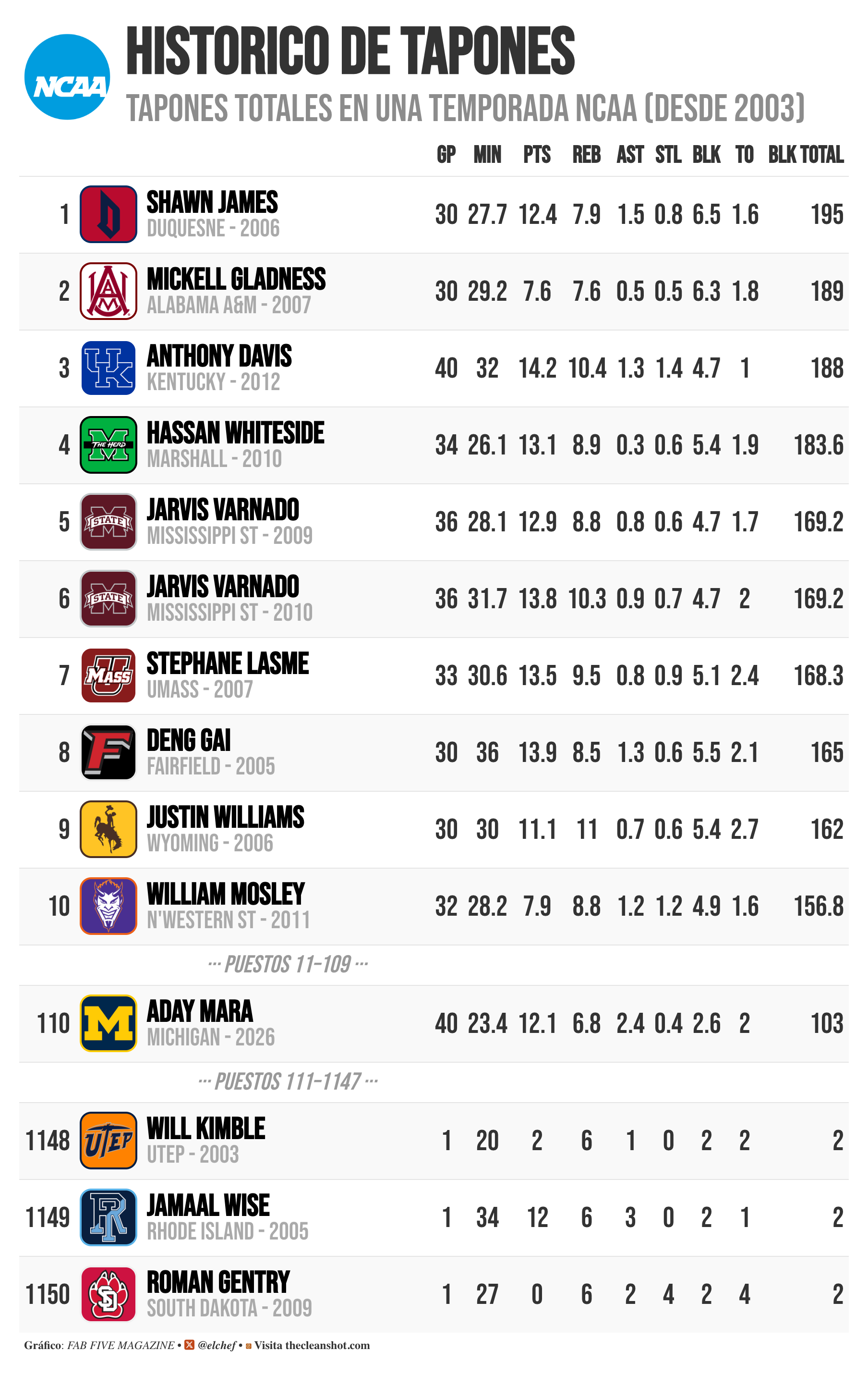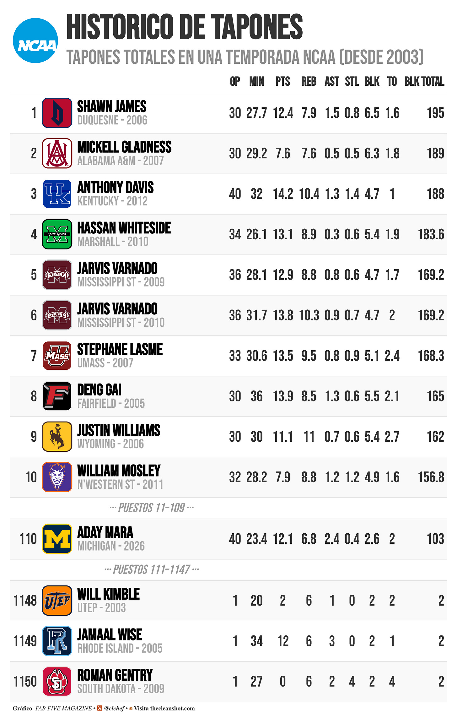 103 tapones. En una sola temporada. Récord histórico de Michigan y el puesto 110 en la historia de la NCAA desde 2003 — una lista donde conviven Anthony Davis, Hassan Whiteside, Nerlens Noel y Chet Holmgren. Picks de lotería. Números uno del draft. Y Mara entre ellos, con menos minutos que casi cualquier otro nombre de esa tabla. Quizás el puesto 110 no brilla mucho, pero recordemos que ahora se juega muchisimo mas por fuera aunque también a puesto gorracos de tres puntos