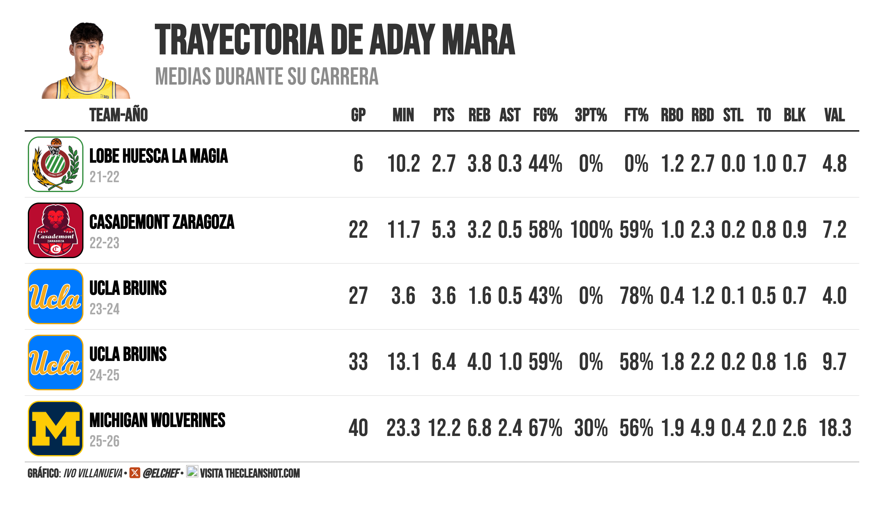 Esta tabla cuenta la historia mejor que cualquier sesudo análisis. En la temporada 23-24, Aday Mara promediaba 3.6 minutos por partido en UCLA. Tres punto seis. El tiempo que tarda un semáforo en cambiar tres veces. Un año después, 13.1. Este año, en Michigan: 23.3 minutos, 12.2 puntos, 67% en tiros de campo y una valoración de 18.3.