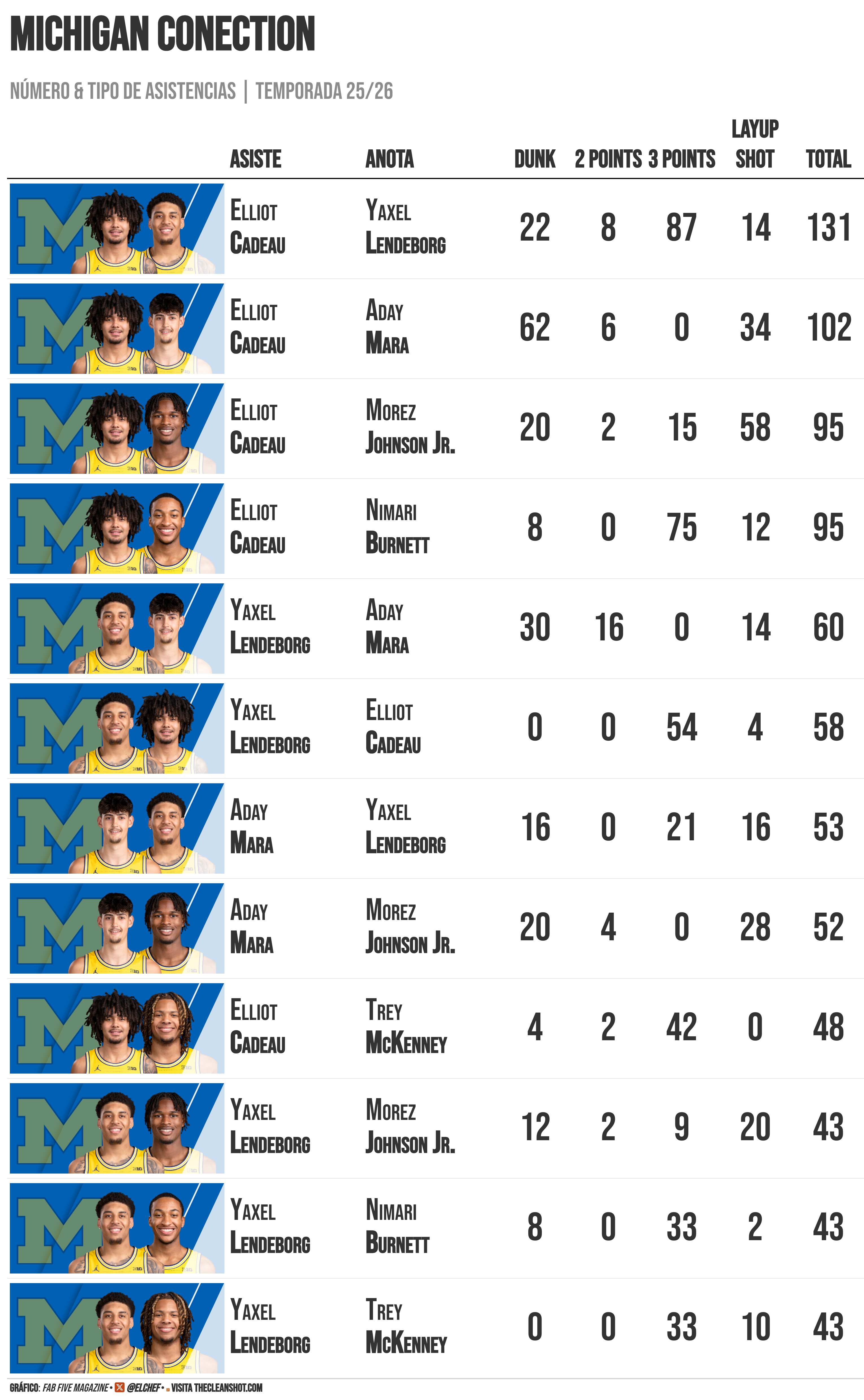 Cuando preguntaban a los jugadores siempre, todos incluso Dusty May destacaba la falta de egoismo de este equipo y bien que lo demuestra las muchas conexiones que ha habdo. Las dos conexiones mas prolificas han sido Cadeau con Axel y luego con Mara hasta 102 veces encontró Cadeau a Mara para anotar en esta temporada 62 de esas 102 acciones terminaron en mate. Sesenta y dos. El pick-and-roll más letal de la NCAA todos tardemos muy poco en aprenderlo de memoria esa jugada de bloqueo arriba y corte hacia dentro.