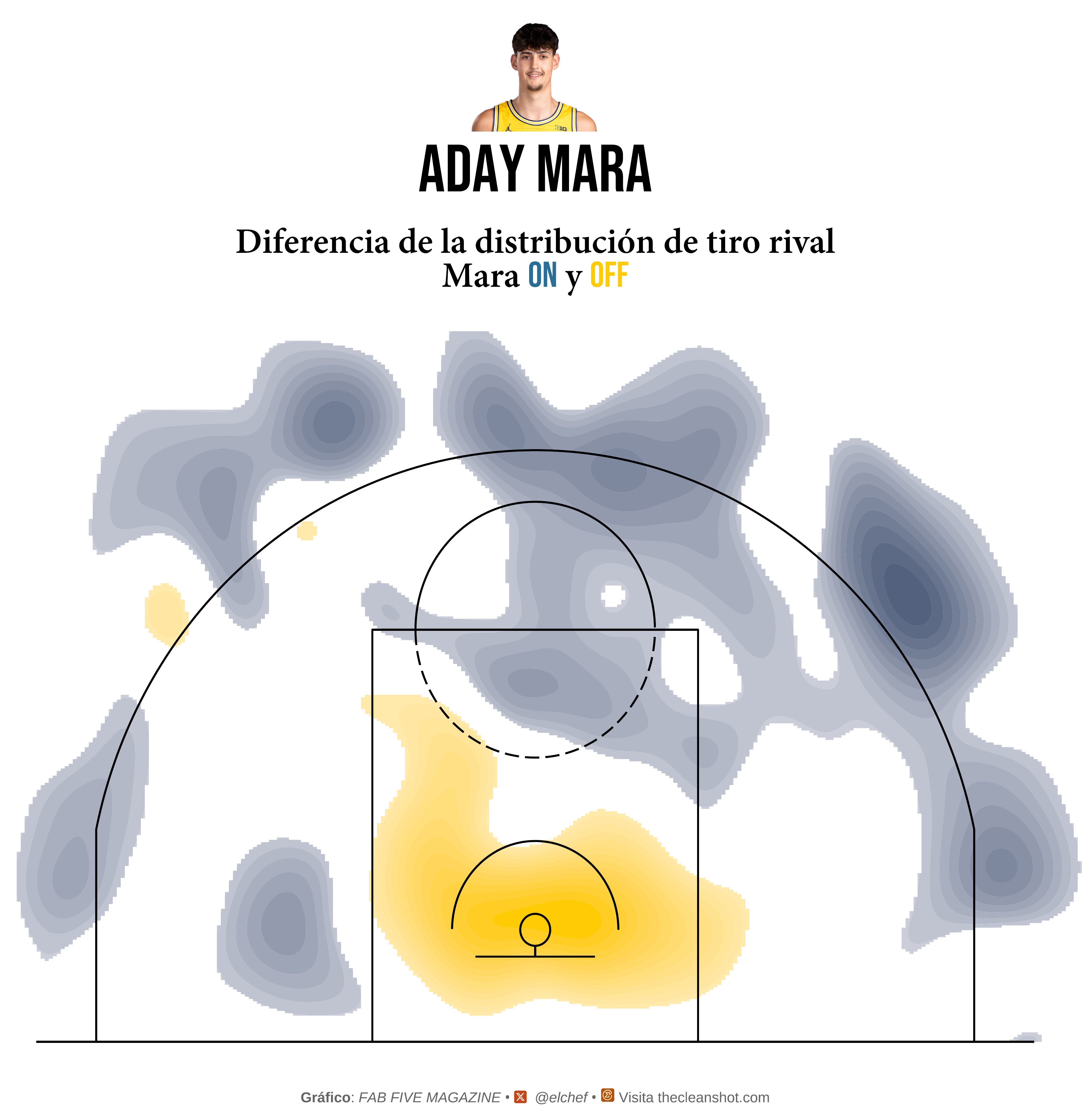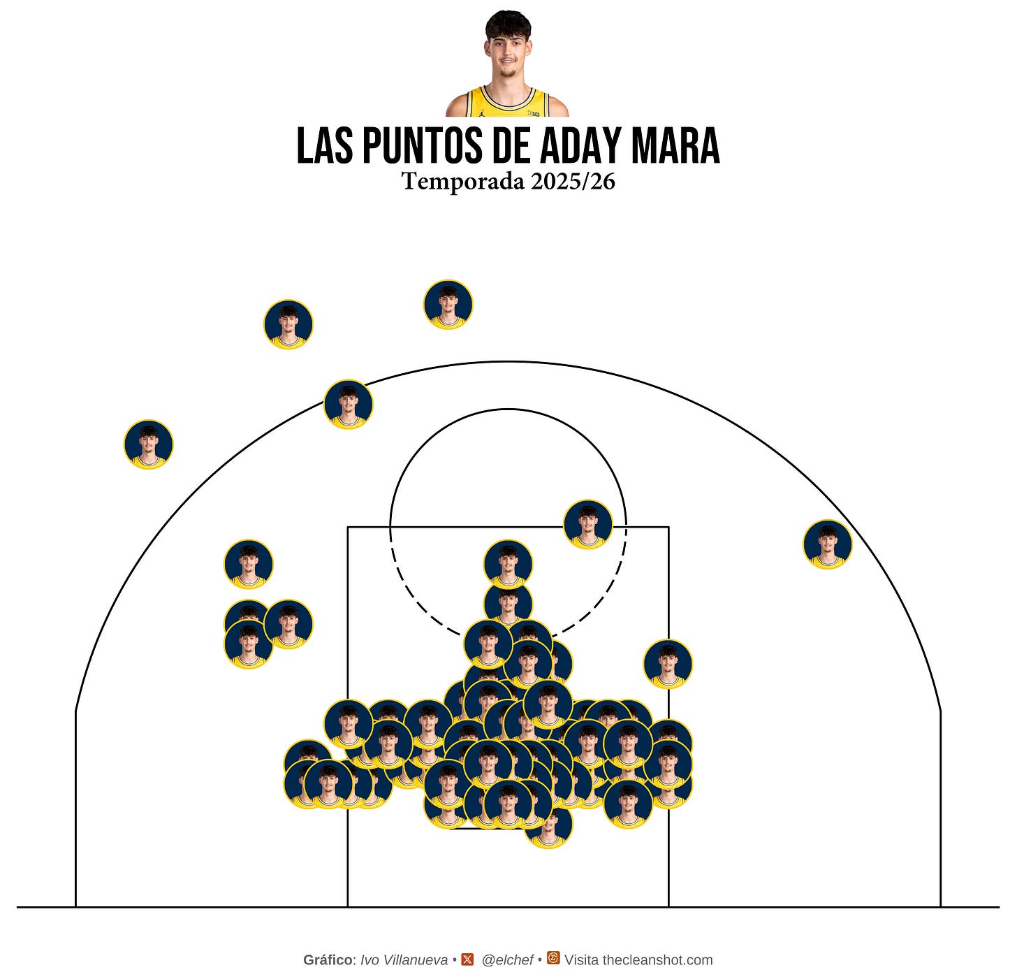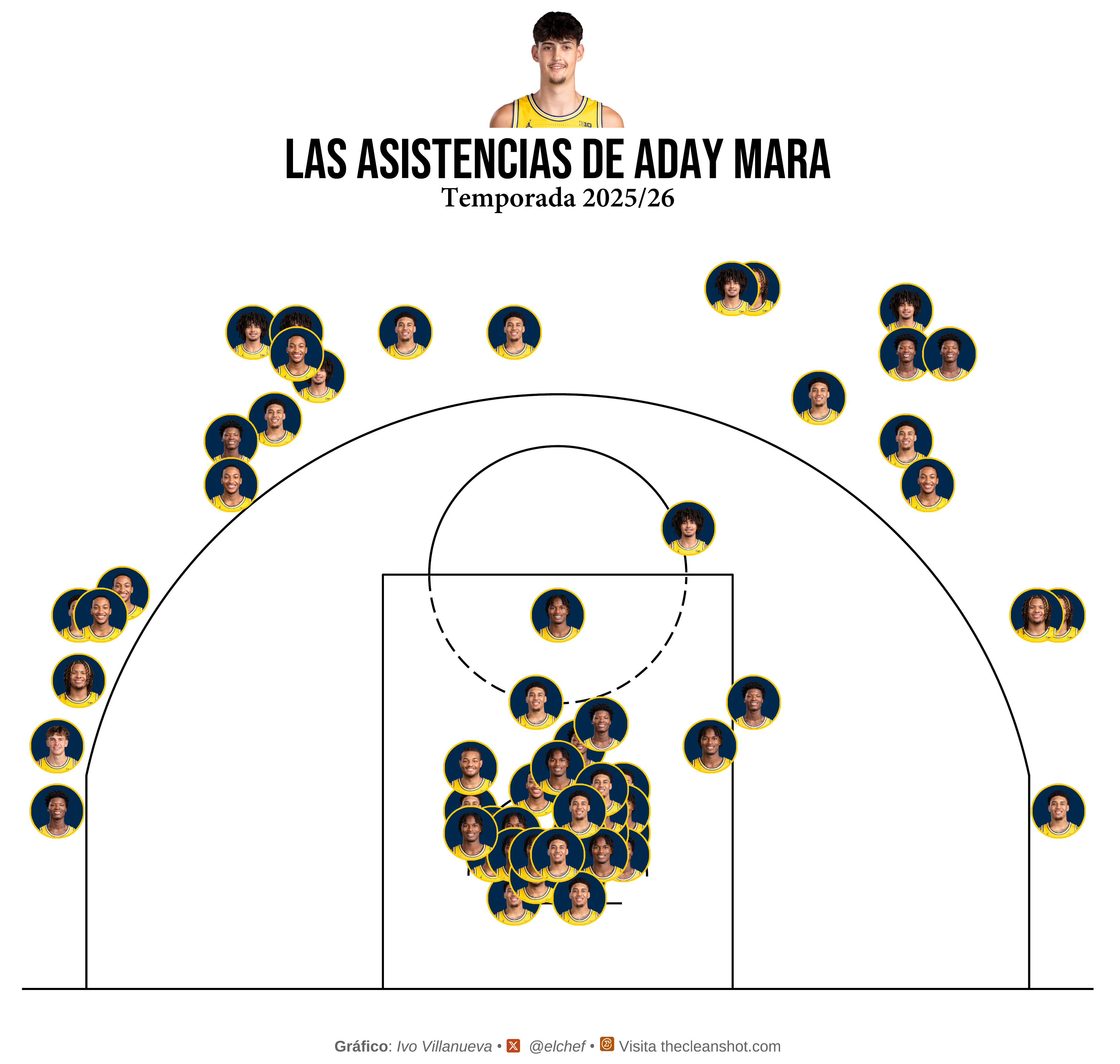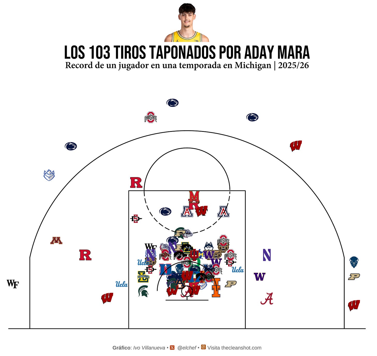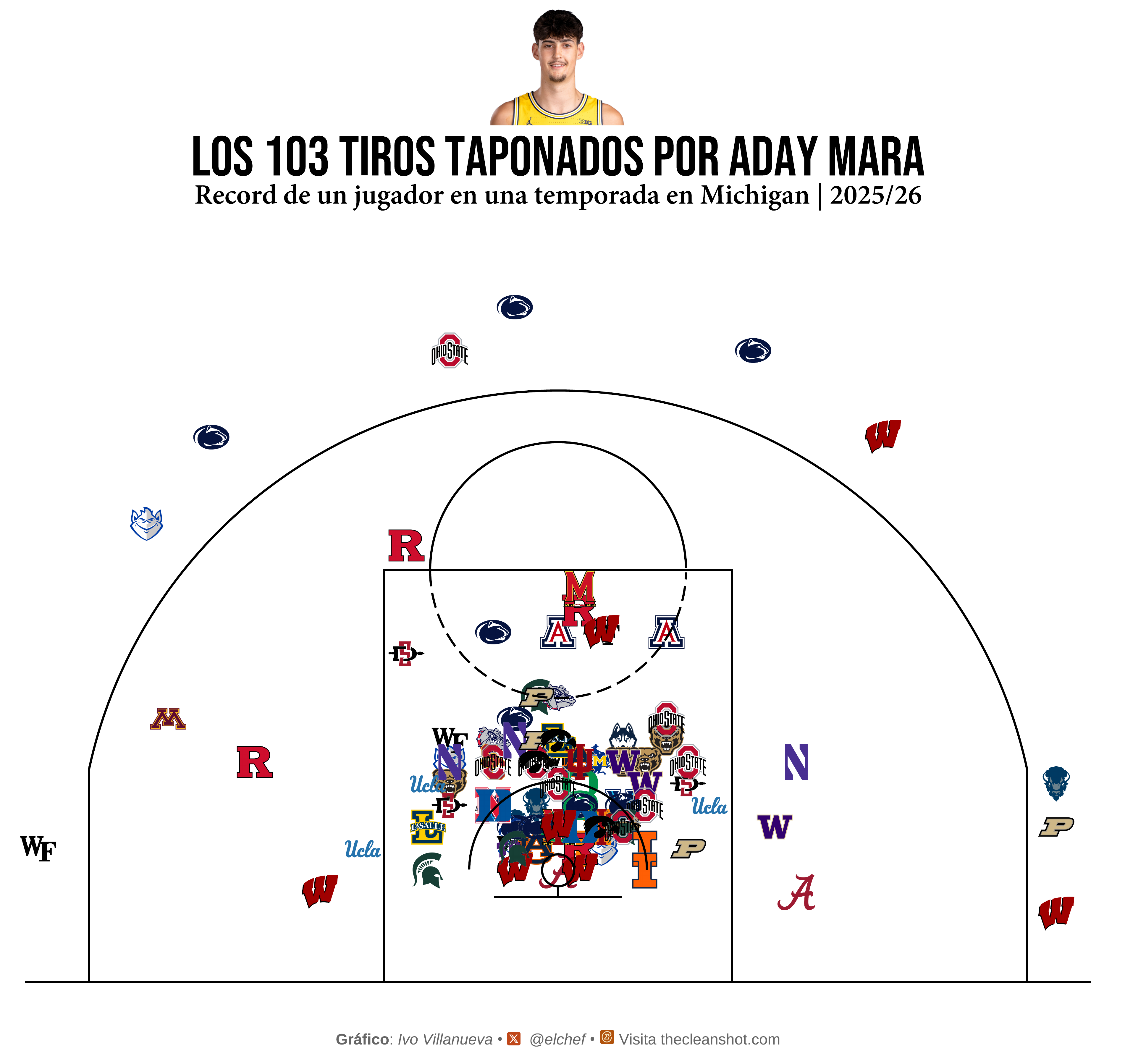 Cada logo es un tiro que no entró. Un jugador que salió al aro con confianza y se encontró con dos metros treinta y cinco de problema qué venía hacía el. La concentración de logos en la zona pintada no es casualidad es el epicentro de la onda sismica. El aro de Michigan era casi suicidio, una jugada que iba a acabar mal; cada punto en la zona se celebraba como un gol de fútbol, y los rivales lo sabían. Y cal final se veía que muchas jugadas eran ya un tema de ego. Meterla por encima de Aday.