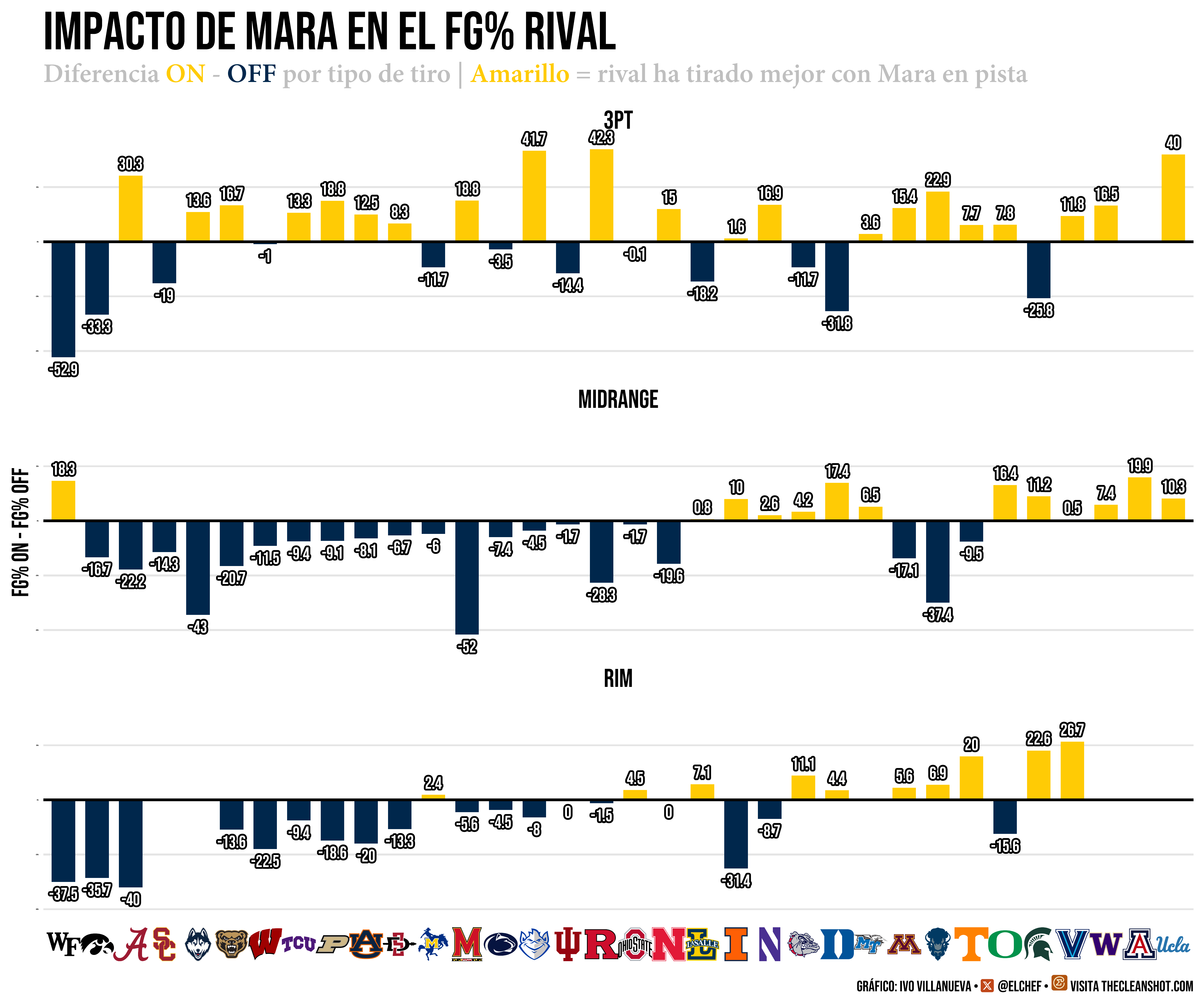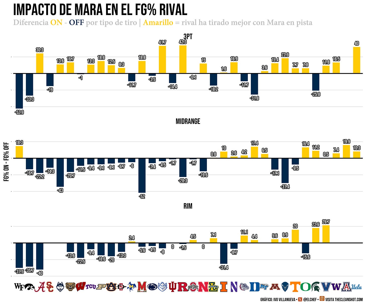 Partido a partido, equipo a equipo: la mayoría tira peor con Mara en pista, especialmente en media distancia y en el aro. No todos, hay noches donde los triples caen de todos modos, donde la defensa colectiva cede. Pero la tendencia es brutal y consistente. Mara no es una anomalía estadística de tres partidos. Son 40 encuentros de impacto defensivo documentado. Lo saben los entrenadores rivales. Lo saben sus compañeros. Y lo saben, sobre todo, los scouts de la NBA que llevan meses en las gradas de Ann Arbor.