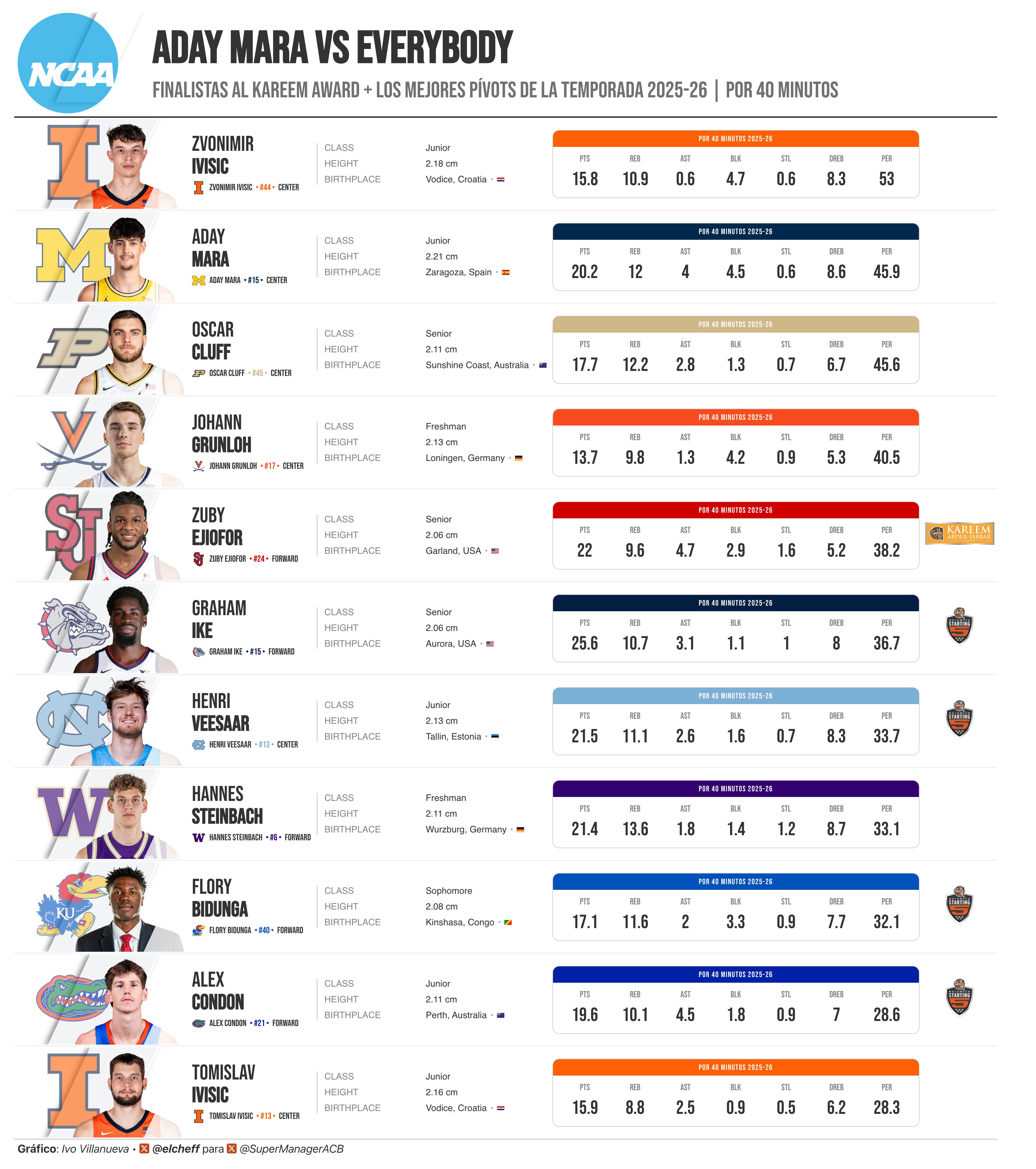 Y aun así. Por 40 minutos, tiene el mejor BLK de esta lista. No por poco. Por diferencia. Y el segundo PER, solo por detrás de Zvonimir Ivisic, que juega seis minutos menos que él y que acumula sus números en ráfagas cortas y brutalmente eficientes.