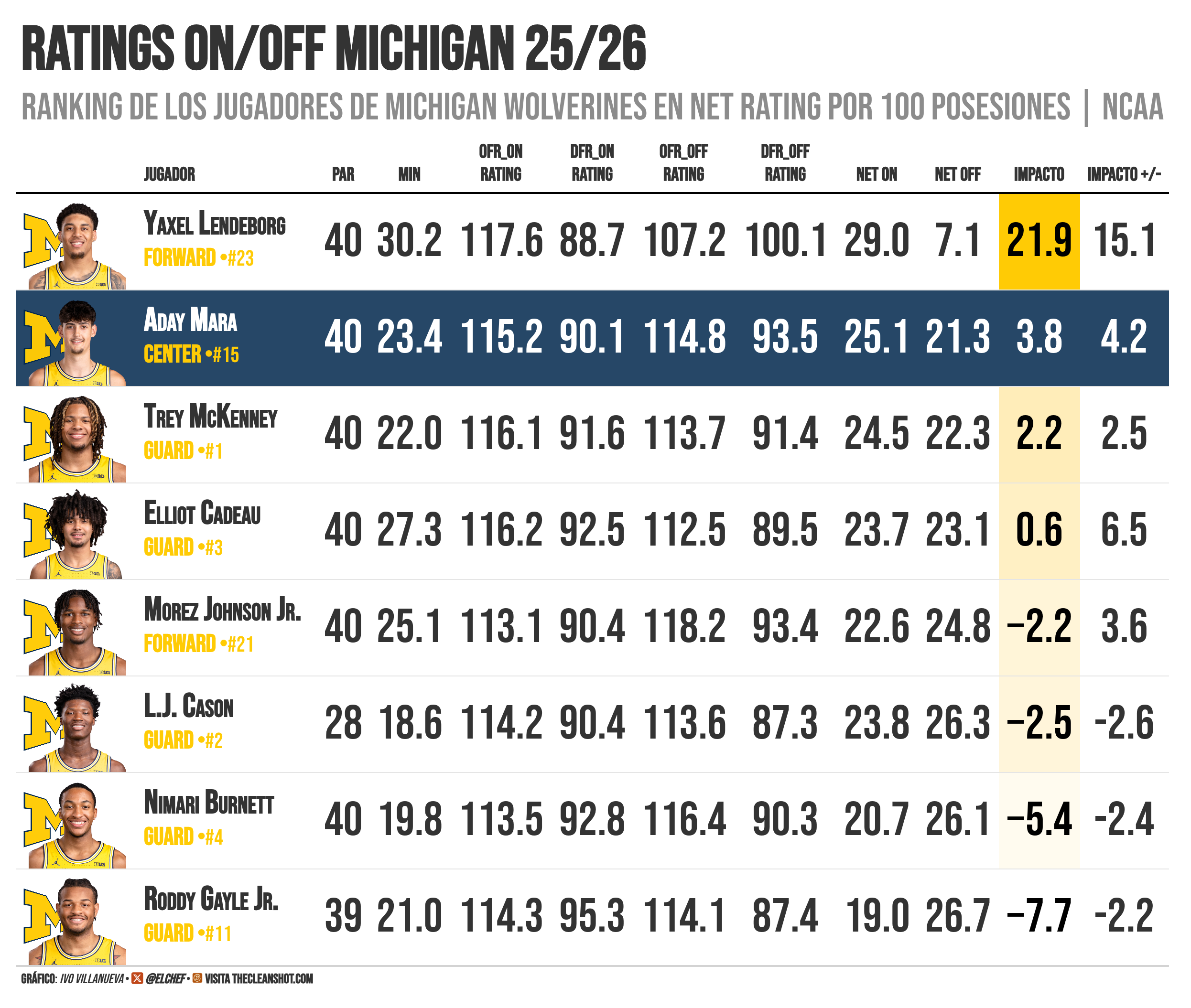 Net Rating de +25.1 con él en pista. +21.3 sin él. Segundo mejor impacto del equipo solo por detrás de Lendeborg, que jugó 7 minutos más por partido. El número que lo resume todo: Michigan era un equipo diferente ,mejor, cuando Aday Mara estaba en la cancha. Y él lo sabe, aunque lo dice a su manera: "Estoy contento de poder tomar yo la decisión, elegir. No tendría ningún problema ni en ir a la NBA ni en quedarme en Michigan, las dos opciones me parecen muy buenas."