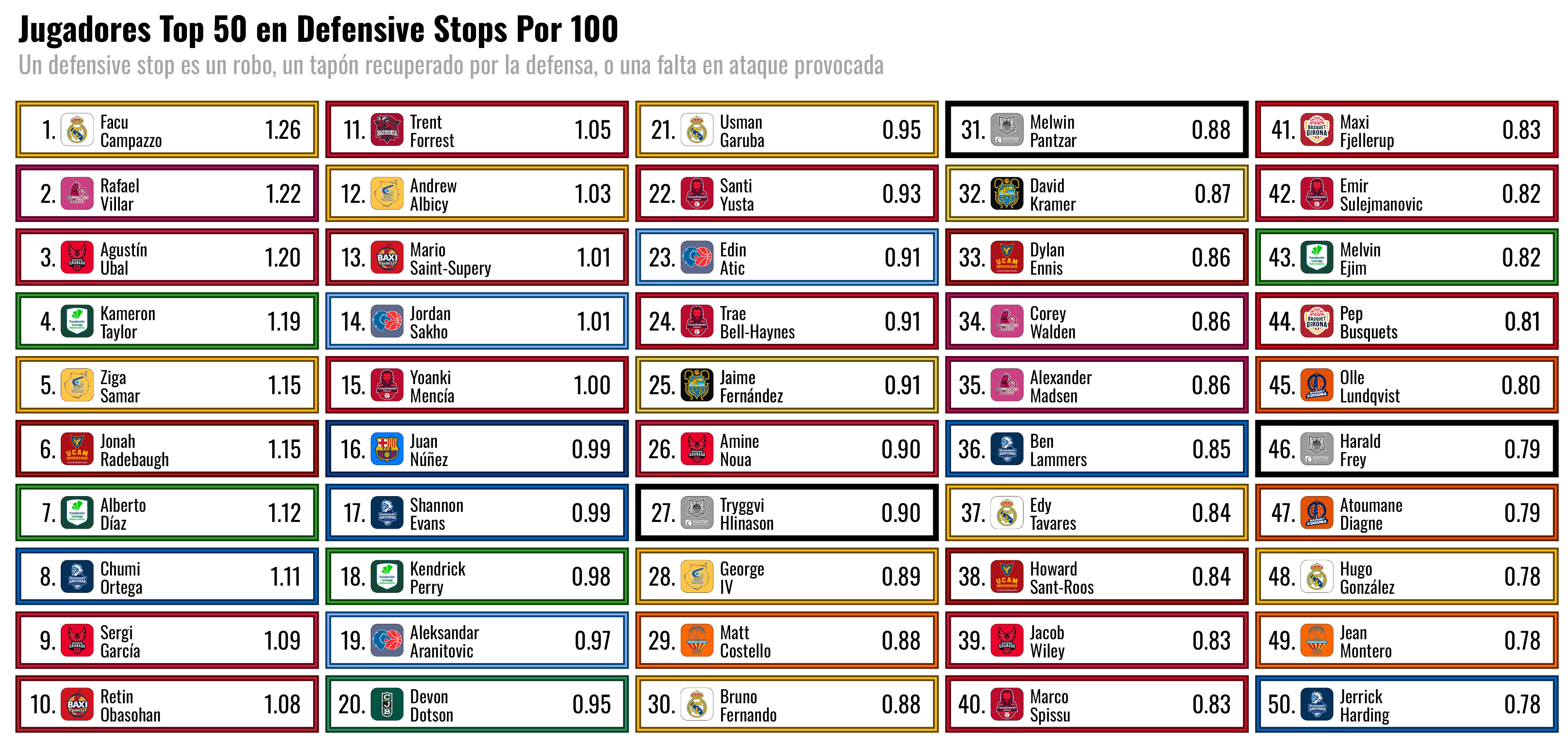 Ninguno de ellos nos sorprende, ya intuiamos cuando los vemos defendiendo que su presencía mejoraba la defensa colectiva, cerrando el rebote, forzando tiros del rival y cerrando las líneas de pase. Ahora ya si le podemos poner un número a su esfuerzo