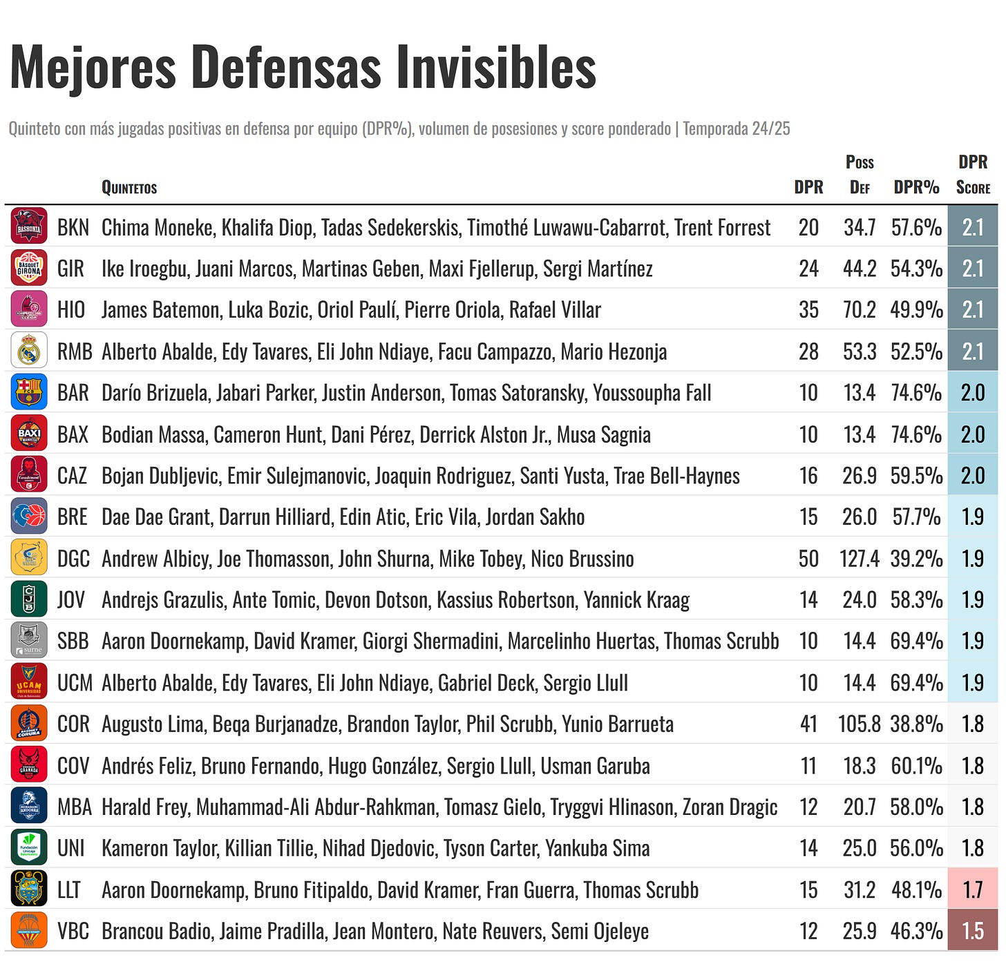 Son quintetos que evitan puntos sin destacar en highlights, obligando a tiros forzados, cerrando bien el rebote o generando pérdidas por buena colocación.