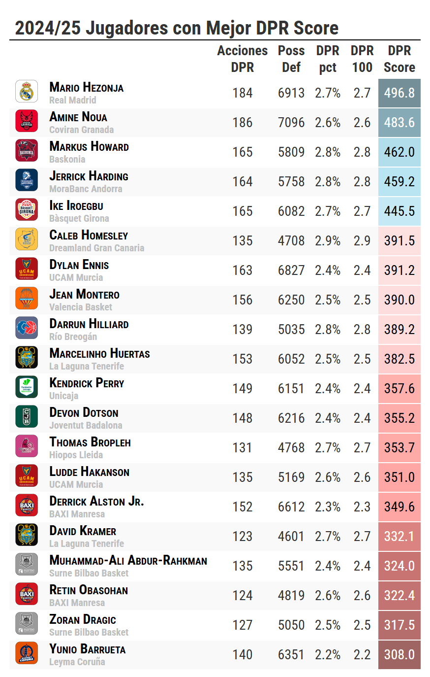 Aquí se me presentó un dilema, como medir los mejores, ¿por su DPR? ¿Por las acciones defensivas en las que han participado? ¿El porcentaje entre la una y la otra? Así que me puse a investigar cual era la manera de ponderar todo esto y de ahi la columna Dpr Score. Esto es un indicador que combina la eficiencia defensiva silenciosa de un quinteto (porcentaje de posesiones en las que logran una acción positiva como rebote defensivo o forzar una pérdida) con su volumen de participación defensiva.