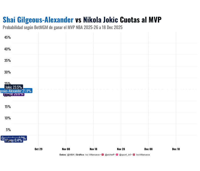 Y ya para acabar la traca final como se ve en el gif la cosa esta muy concentrada en dos nombres. Jokic y Gilgeous-Alexander se han alternado en cabeza con diferencias pequeñas y movimientos frecuentes, mientras que el resto de candidatos permanece claramente separado, con probabilidades mucho más bajas y sin amenazar el liderato aunque lo de Maxey a la misma altura que Cunningham me ha dejado muy loco la verdad.