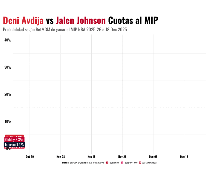 Ya el gráfico muestra un premio muy volátil, tanto como que puedes ser el mejor reserva y de tan bien lo haces que dejas de ser reserva y eres titular y dejas de optar al premio, con cambios frecuentes en el liderato y diferencias pequeñas entre los principales candidatos. Ningún jugador ha conseguido estabilizar su posición en las cuotas, lo que refleja un premio abierto y muy sensible a variaciones puntuales de rendimiento y rol y en los que se puede colar por ejemplo un Jaime Jaquez de la vida. Como por ejemplo el Salto de Black desde el 28 de noviembre hasta el pimer puesto de hoy.