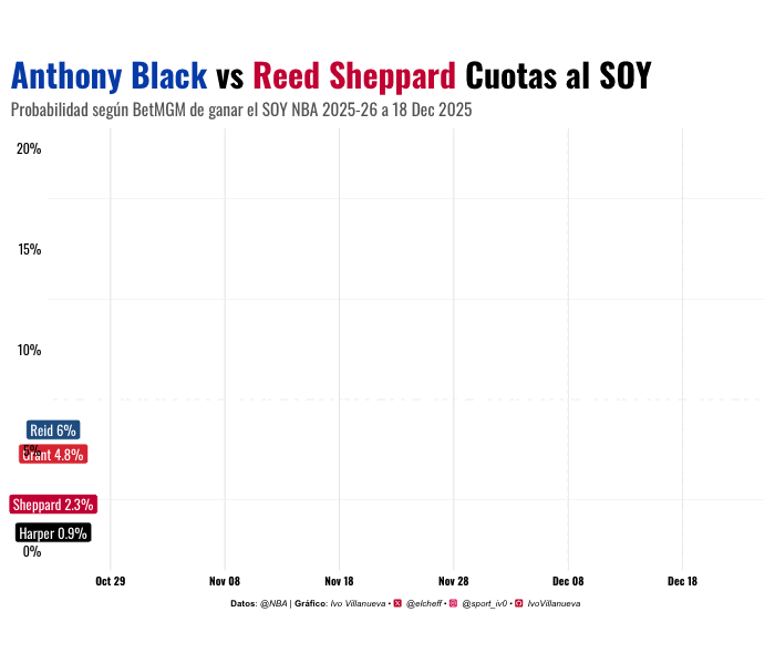 Las casas de apuestas reflejan este mismo grupo como núcleo del premio. Anthony Black y Naz Reid aparecen de forma recurrente en la parte alta de las cuotas, con Reed Sheppard ganando terreno tras sus primeras semanas de producción eficiente. Jerami Grant se sitúa en un segundo escalón y Harper aparece más como longshot.