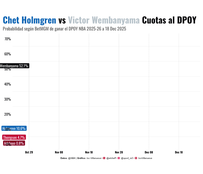 Como el GIF muestra hay un dominio claro de Wembanyama en las cuotas. Durante su ausencia por lesión, Holmgren pasa a liderar el mercado pero ese cambio de liderato coincide con disponibilidad, no con una inversión de rendimiento. Aunque ahora mismo es el dos comienzo con el que salvo cataclismo tipo que vengan los primos alliens de Wemby será el defensor del año