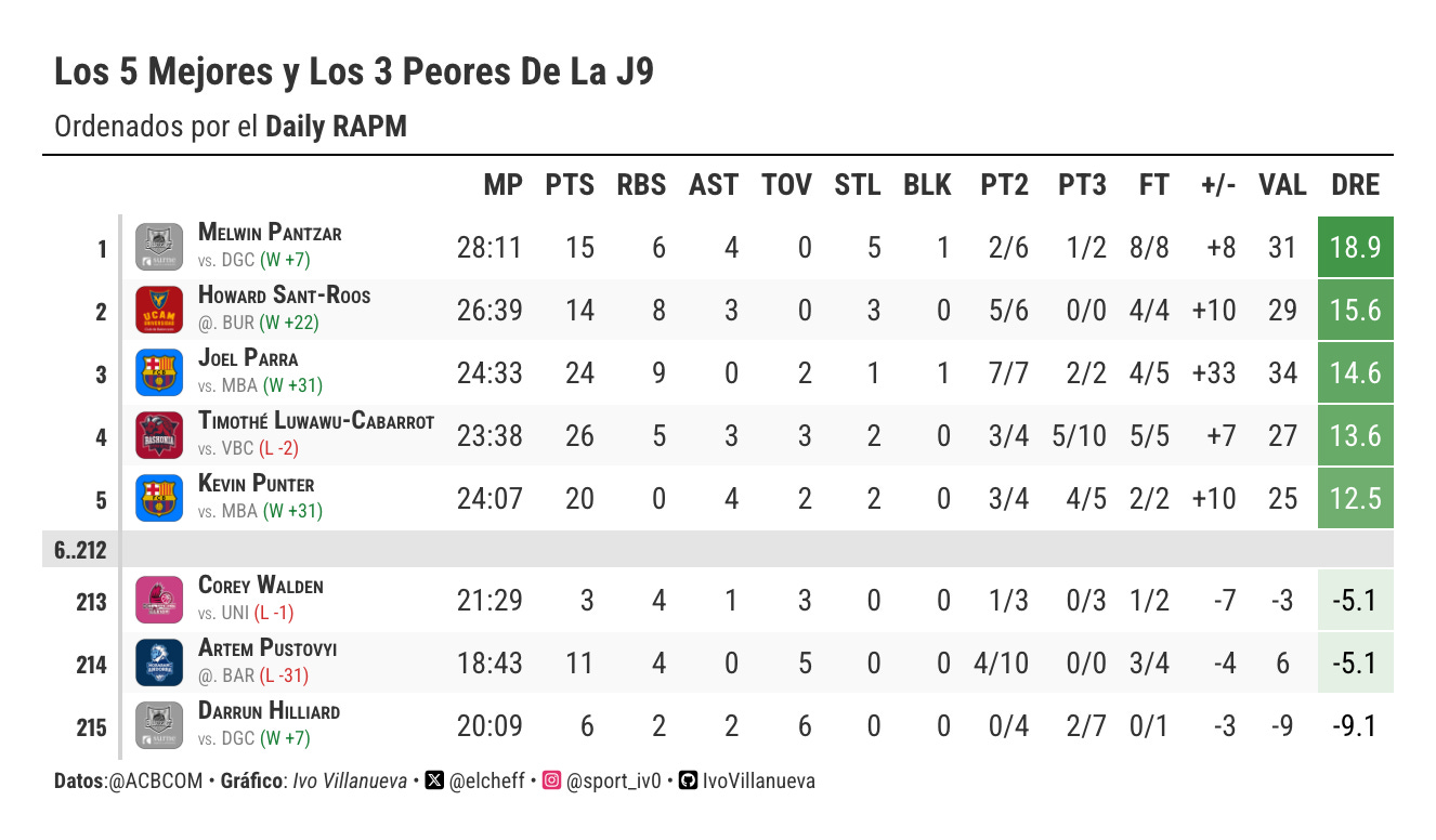 Una semana más, como es habitual, voy a empezar analizando la última jornada, la 9, por el impacto global que nos revela el Daily RAPM. (Recordaros que: la tabla completa está en mi perfil, en la pestaña ‘Los mejores de la jornada’).