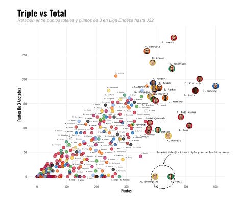 Mostramos los puntos de cada jugador dentro del geom_point, con sombra negra para que se lean bien.