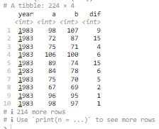 mutate(dif = abs(a - b)) #extraer la diferencia absolutaConseguiríamos una tabla como esta