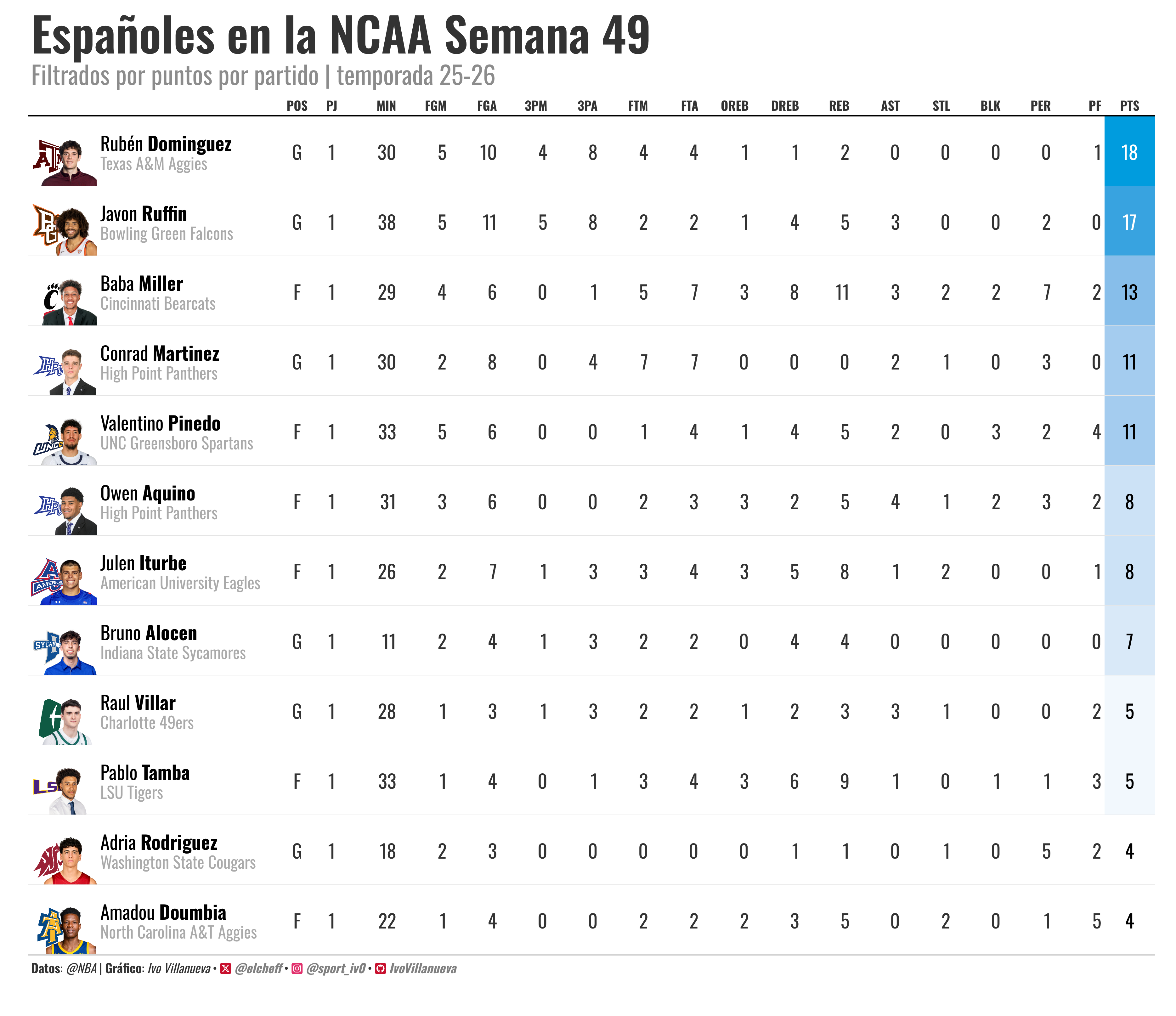 Para cerrar este post dejo las estadisiticas de esta semana hasta hoy de los jugadores españoles en la NCAA. Rubén Rodriguez sigue intratable y la buena noticia de la vuelta de Baba Miller con un doble de 13-11