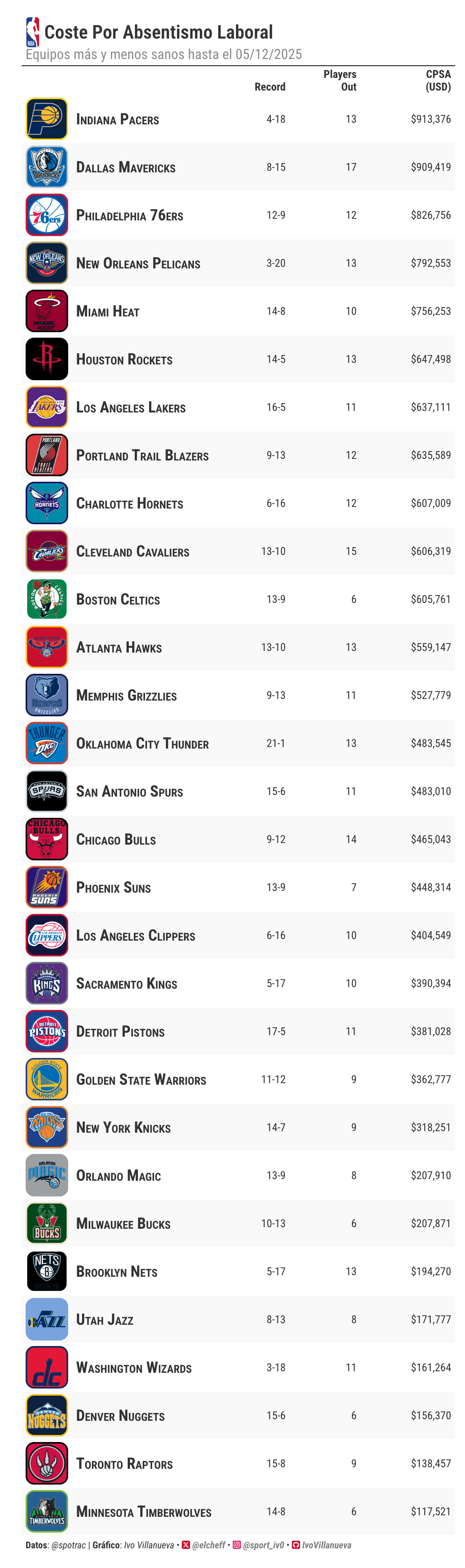 Cierro con Dallas. (todos pensamos en el mismo) Está cuarto en quintetos usados. Haciendo el seguimiento mientras escribia este post tengo que reconocer que ha recuperado puestos y conseguido algo de estabilidad, pero su rasgo principal es el costo. Secunda la liga con 909,419 dólares por CPSA. Su inestabilidad no viene de una búsqueda de flexibilidad. Es el resultado de perder a sus figuras. El 8-15 es una consecuencia directa. Sin ellas, todo se vuelve improvisación y el equipo pierde rumbo.