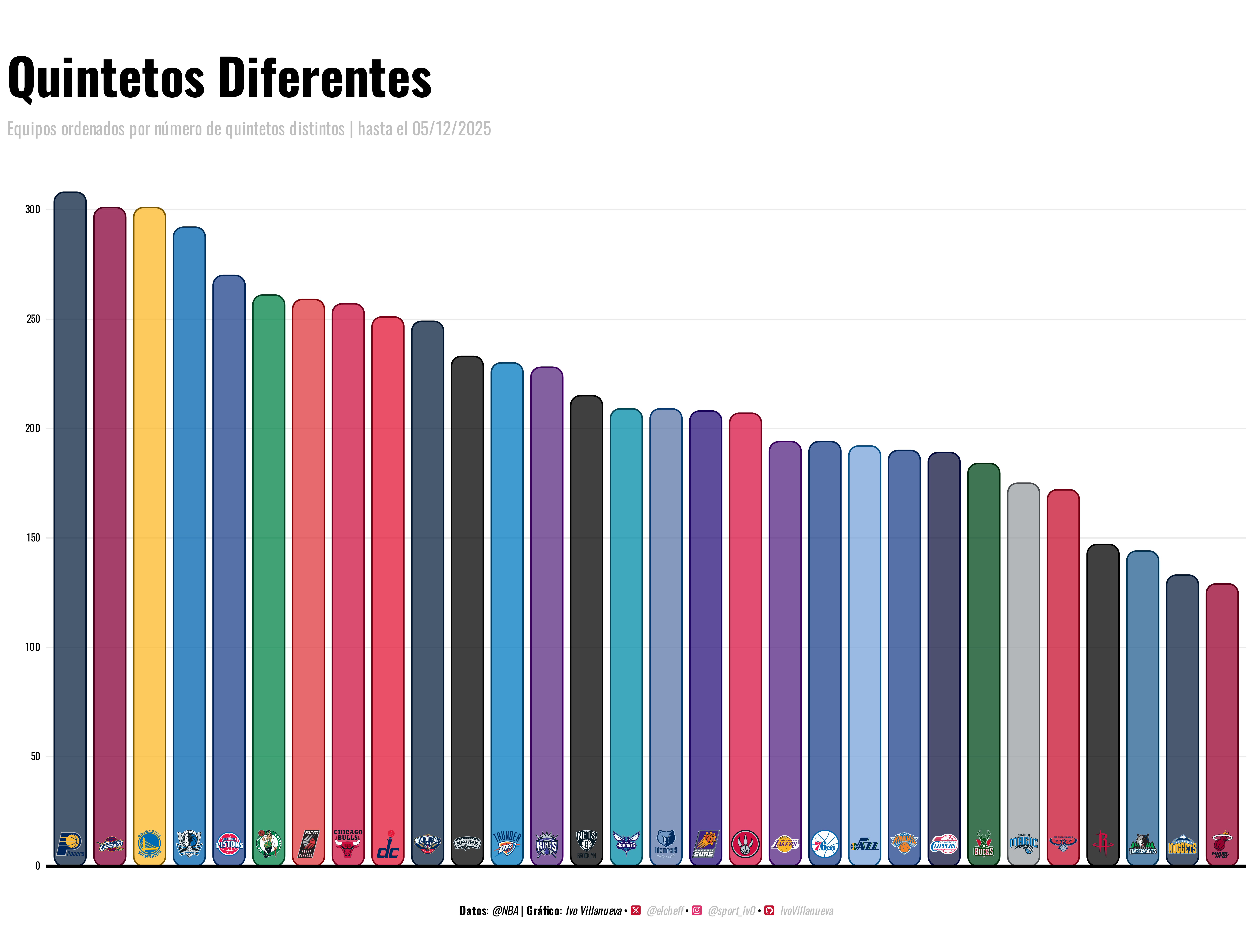 Empiezo por Indiana. Es el equipo que más quintetos ha usado. Esa inestabilidad no nace de una decisión técnica. Es el efecto directo de las bajas de sus jugadores clave. Lo confirma su primer puesto en costo, con un CPSA de 913376 dólares. El resultado es claro. El equipo ha perdido cohesión y firma el peor récord de la liga con 4-18.