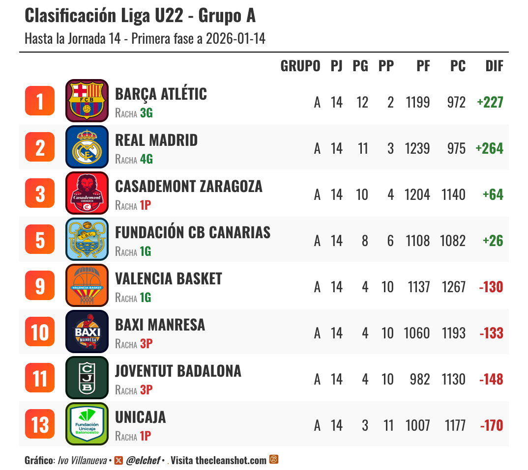 Tras la primera fase, los seis primeros clasificados del grupo A aseguraron su continuidad en la élite. Barça Atlètic (12-2) y Real Madrid (11-3) marcaron el ritmo en la parte alta, seguidos por Casademont Zaragoza (10-4), Fundación CB Canarias (8-6) y Joventut Badalona (4-10), que se benefició del triple empate con Valencia y BAXI Manresa. Desde el grupo B, Gran Canaria, líder con un sólido 11-1, logró el ascenso directo al grupo A.