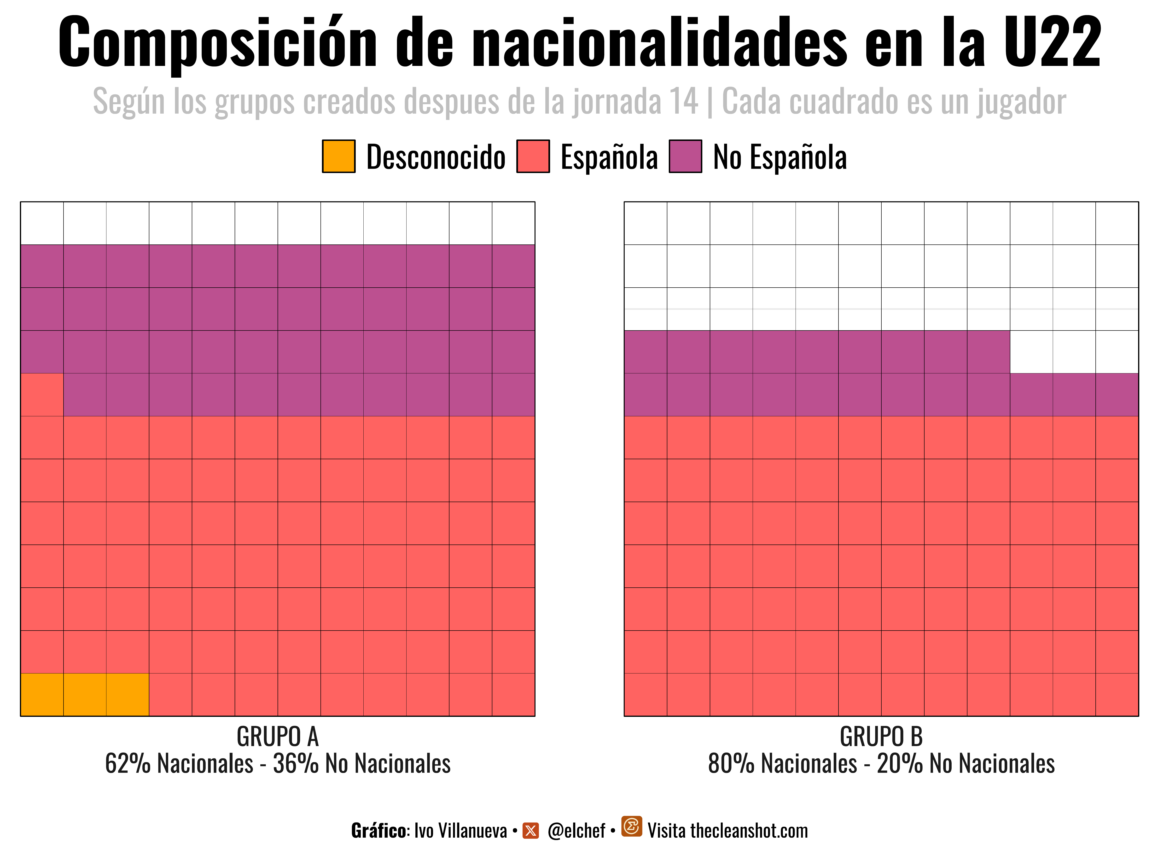 Y ahora vuelvo al principio. Y ahora que hemos agitado el bote, lo hemos dejado reposar y, como siempre, el agua y el aceite han terminado separándose vemos como los grupos ya se han decantado: el grupo A, el de los buenos, y el grupo B, con B de menos buenos. Con este reparto encima de la mesa, voy a mirar algo incómodo para algunos, porque entiendo el esfuerzo y el cariño con el que se está haciendo este proyecto: cuántos jugadores nacidos en España hay realmente en cada grupo.