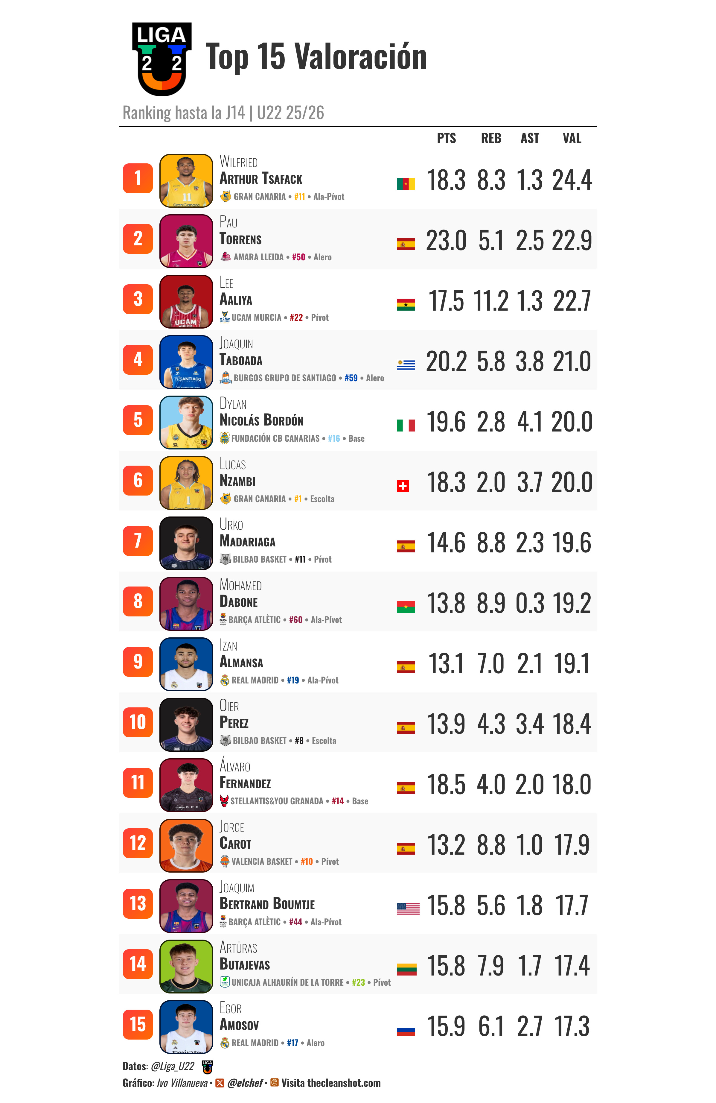 Este es el Top 15 hasta la jornada 14. Seis de los quince jugadores más destacados no son nacionales, un 40%, lo que deja un dato aún más claro: el 60% del Top 15 no es talento nacional. El grupo A está compuesto en un 63% por jugadores nacidos en España y en un 36% por jugadores no nacionales, pero cuando miramos a los que más impacto tienen, la proporción se invierte. No es un Pareto perfecto, es dificil ignorar lo que se puede leer entre lineas: en una liga que nace con la idea de retener talento nacional, la mayoría de los jugadores más determinantes no forman parte de ese talento que, en teoría, se quiere proteger.