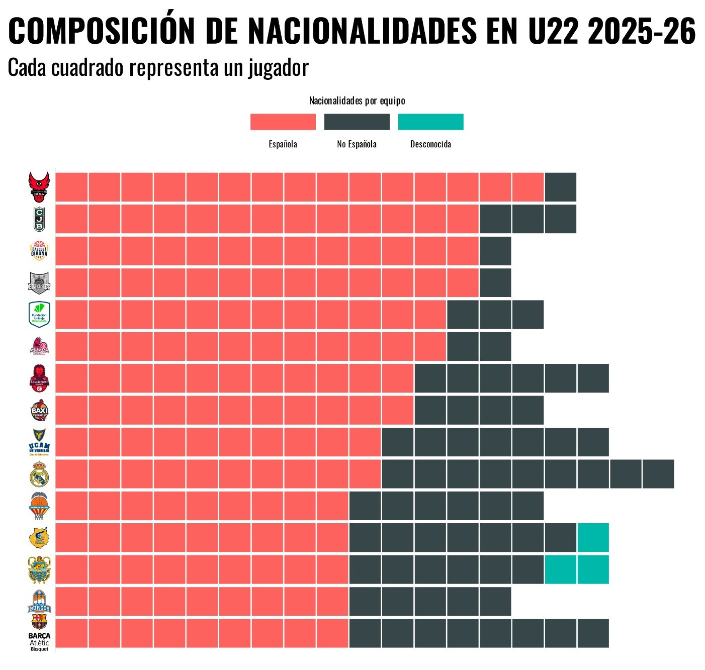 En el grupo B, y esto a mí me da un poco de pena, es donde hay mayoría de jugadores españoles y, al mismo tiempo, donde los equipos son menos competitivos. No estoy diciendo por qué pasa ni cómo trabaja nadie. El dato es ese: cuando el nivel baja, el jugador nacional aparece más; cuando el nivel sube, desaparece.