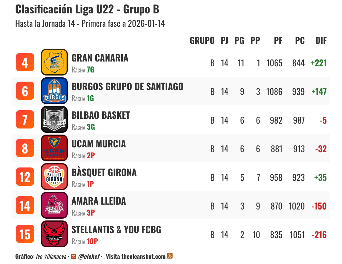 La Liga U ya ha afrontado su jornada de repesca (play-out) como punto de inflexión, con dos eliminatorias a partido único que definieron el acceso al Grupo A en la segunda fase: Burgos Grupo de Santiago se impuso por 87-85 a Valencia Basket y BAXI Manresa venció a UCAM Murcia por 79-72, resultados que confirmaron el ascenso del conjunto burgalés al Grupo A en lugar de Valencia y la permanencia de Manresa en ese grupo. Resueltos estos cruces, la competición entra ahora en su segunda fase, de nuevo dividida en dos grupos y con una liga completa a doble vuelta sin arrastrar resultados, antes de abrir el camino hacia el play-in y la posterior Final 6, donde se decidirá el campeón de la Liga U 25/26 y se configurará la composición de los grupos para la temporada 2026/27.