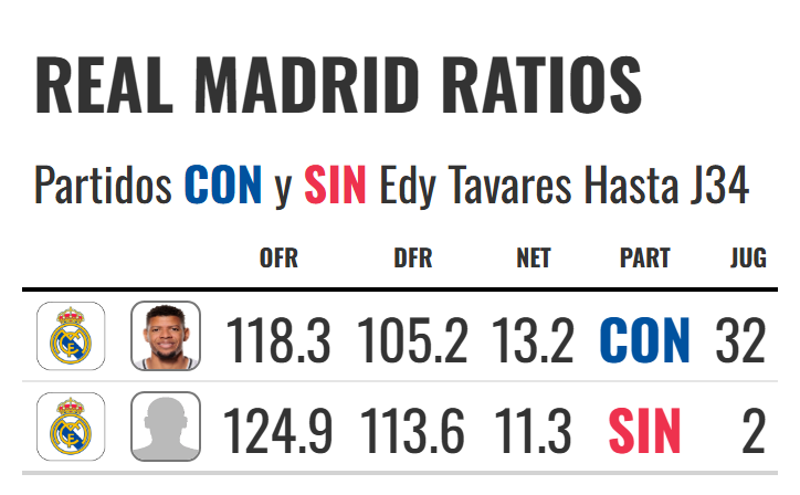 En este contexto, me interesa fijarme en el Real Madrid (mejor ratio defensivo): no solo en los minutos en los que Tavares está en el banquillo, sino también en los partidos completos en los que no ha jugado, ya sea por lesión o whatever.