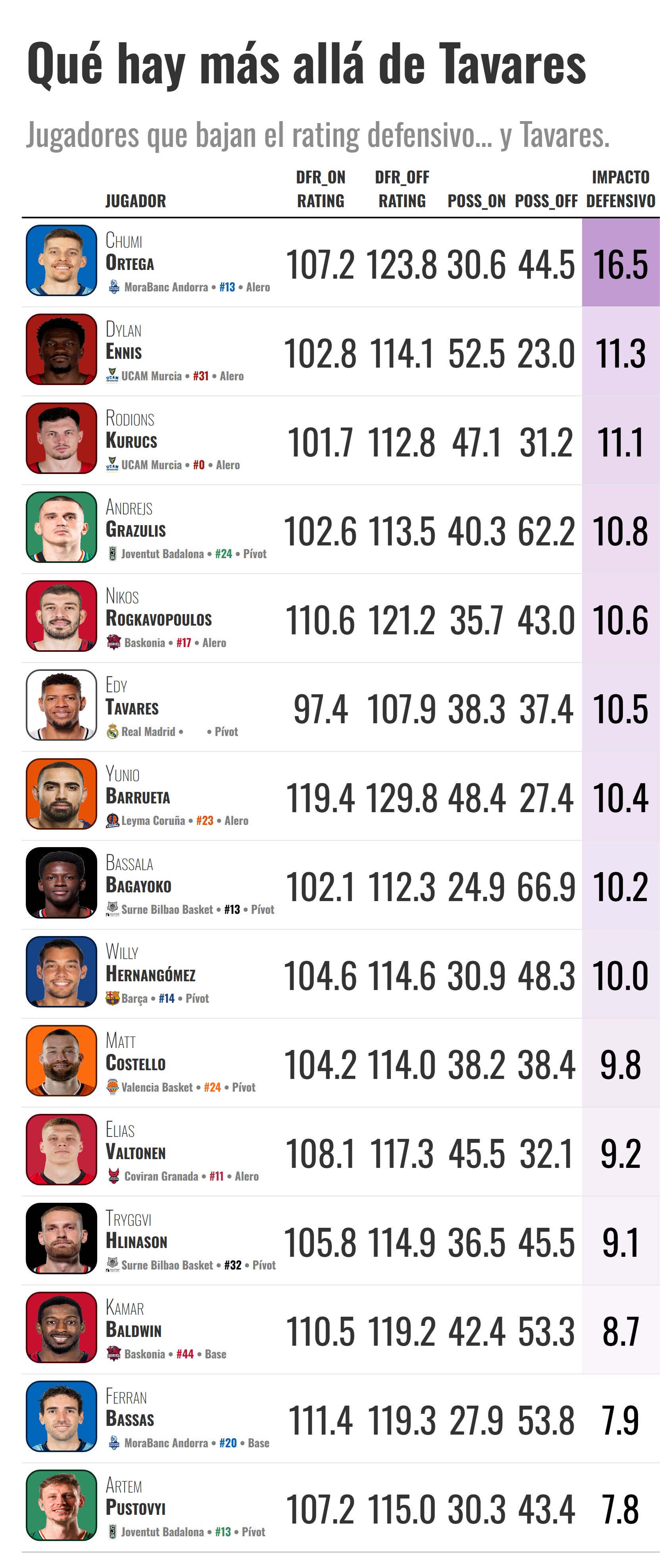 Estos datos te lo cuentan: sí, Tavares es el que más bajo deja el rating defensivo de su equipo, pero no olvides a los que bajan el rating mucho más en comparación, aunque nadie los mencione, ni en las encuestas ni en las votaciones. Y algunos, como ves en las tablas, lo hacen en equipos que ni siquiera están arriba en la clasificación.