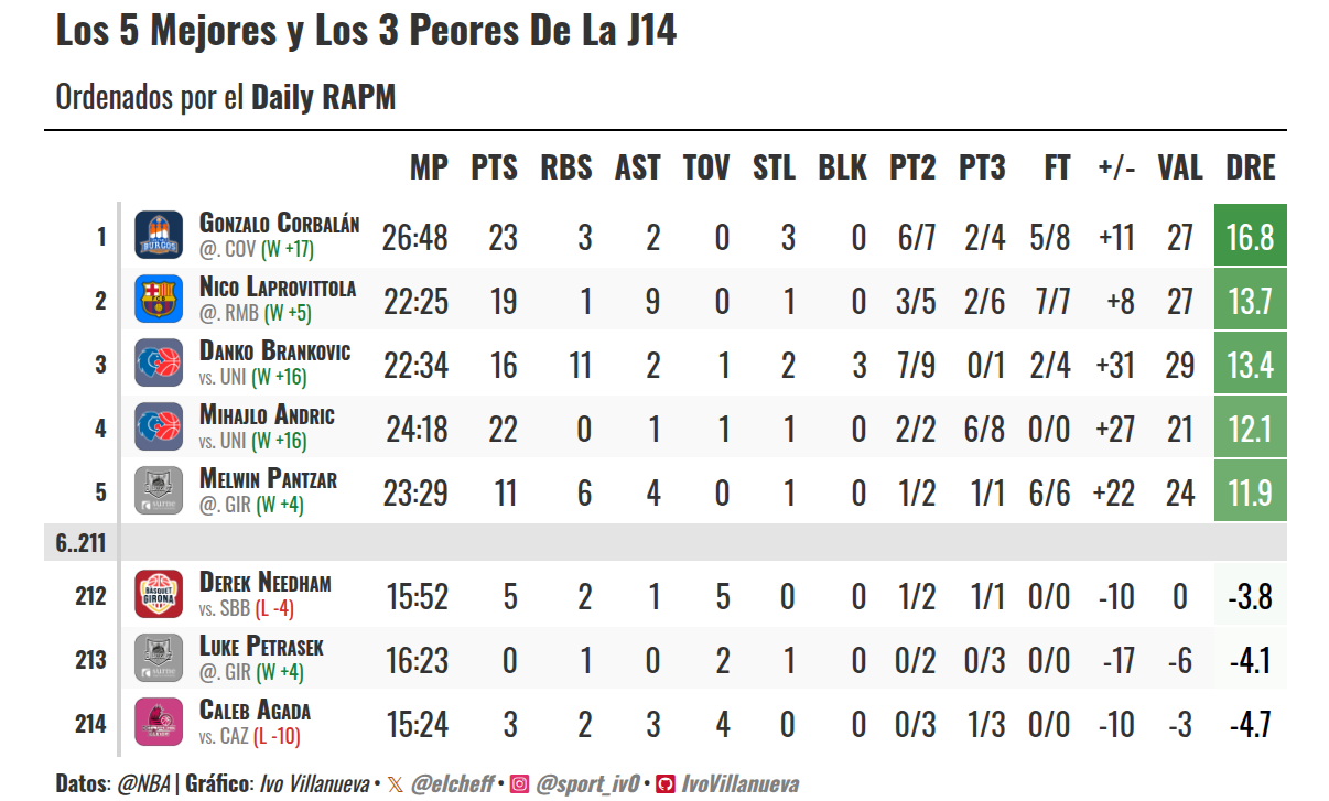 Con Gonzalo Corbalán reconozco que tengo una relación de odio-amor bastante fuerte. Odio desde el partido del año pasado en el que San Pablo Burgos nos ganó 91 95 al Estudiantes. Aquel día nos metió 23 puntos, cogió 7 rebotes, se fue a 29 de valoración y acabó levantando el puño a la grada. Lo tuvimos ahí. Pero también hay amor, porque sabiendo el jugador que es llevo toda la temporada apostando por él en el SuperManager y, la verdad, me ha dado bastantes alegrías. En esta última jornada se salió con 27 de valoración y además firmó el DRE más alto, con una tarjeta muy limpia, grandes porcentajes y ninguna pérdida, en el enfrentamiento directo ante Covirán Granada para salvar la categoría. Y no fue un hecho aislado: días antes ya había asumido galones en Gran Canaria con 20 puntos y, frente a UCAM Murcia, volvió a ser el referente incluso en la derrota, con 25 puntos y 29 de valoración. Por eso llevo toda la temporada apostando por él.