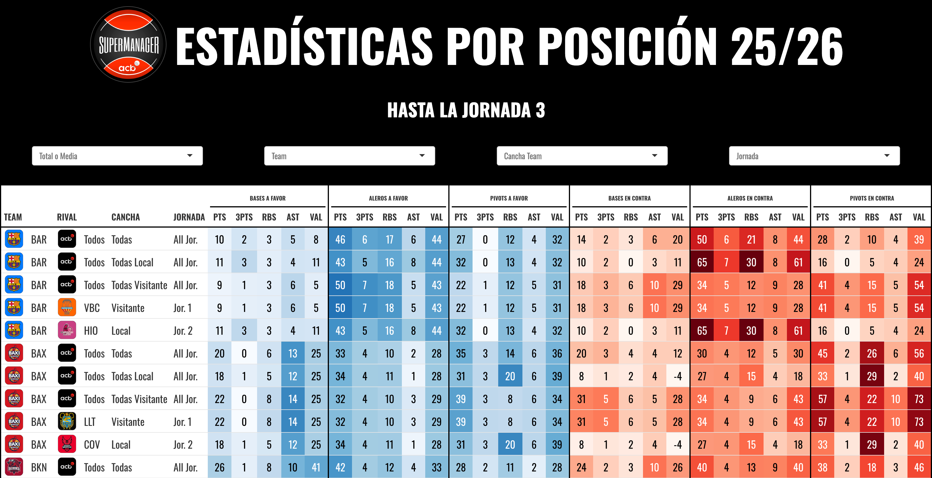 La tabla permite filtrar por equipo, cancha y jornada, y comparar el rendimiento de bases, aleros y pívots tanto a favor como en contra.